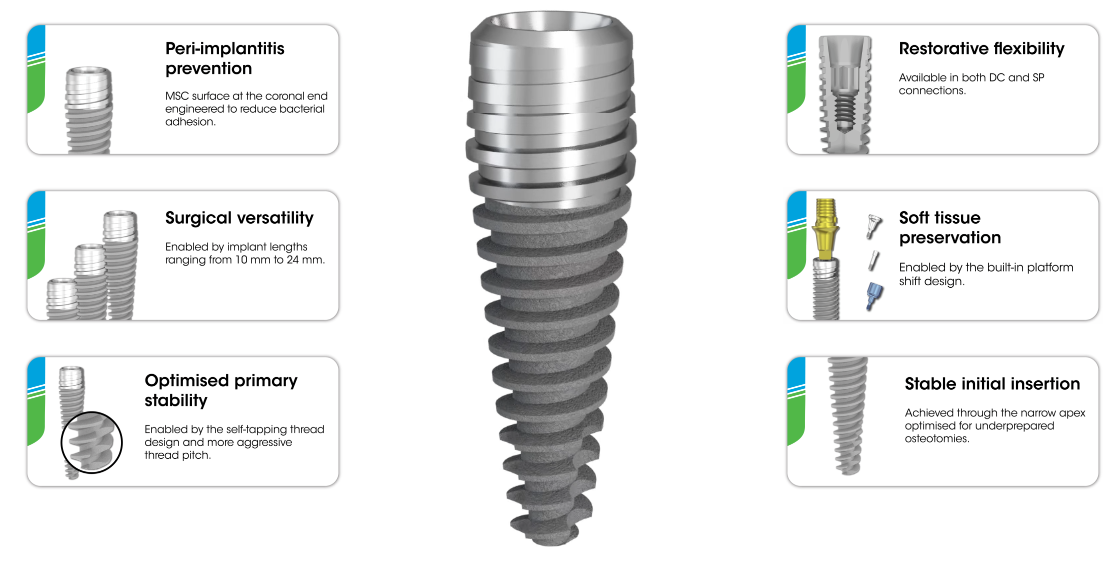 Bề mặt MSC (Machined Surface Coronal) 4 mm được thiết kế để giảm sự bám dính của vi khuẩn và giảm nguy cơ viêm quanh implant.